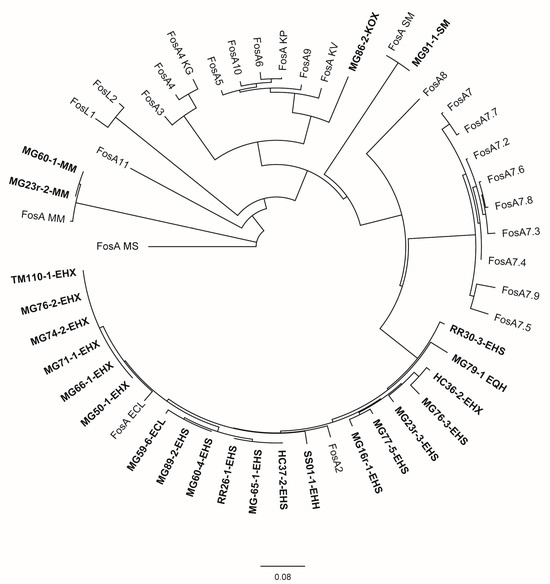 Evolutionary analysis and phylogenetic tree of FosA/C2/L1-2 proteins available in GenBank for Enterobacterales and FosA proteins identified in this study inferred by applying the maximum likelihood method using Geneious Prime® 2023.2.1 GenBank Accession numbers of public sequences are given in parentheses below. Study isolates are written in bold. Isolate MG59-4-EHH was excluded from the analysis due to an interruption of the fosA gene by an IS911 element. ECL = E. cloacae ssp. cloacae, EHH = E. hormaechei ssp. hormaechei, EHX = E. hormaechei ssp. xiangfangensis, EHS = E. hormaechei ssp. steigerwaltii, EQH = E. quasihormaechei, KG = Kluyvera georgiana, KOX = K. oxytoca, KV = K. variicola, MM = M. morganii, MS = multispecies, SM = S. marcescens; FosA ECL (AWG41971.1), FosA KP (CDO16183.1), FosA KV (AWG41960.1), FosA MM (VDY35025.1), FosA MS (WP_154635598.1), FosA SM (QOW96986.1), FosA2 (WP_025205684.1), FosA3 (WP_014839980.1), FosA4 (WP_034169466.1), FosA4 KG (WP_064548962.1), FosA5 (WP_012579083.1), FosA6 (WP_069174570.1), FosA7 (WP_000941934.1), FosA7.2 (WP_000941935.1), FosA7.3 (WP_023231494.1), FosA7.4 (WP_023216493.1), FosA7.5 (WP_000941933.1), FosA7.6 (WP_061377147.1), FosA7.7 (WP_058653118.1), FosA7.8 (WP_079820715.1), FosA7.9 (WP_071684814.1), FosA8 (WP_063277905.1), FosA9 (WP_114473955.1), FosA10 (WP_004214174.1), FosA11 (QZL11398.1), FosL1 (WP_161667239.1), FosL2 (WP_188331883.1).