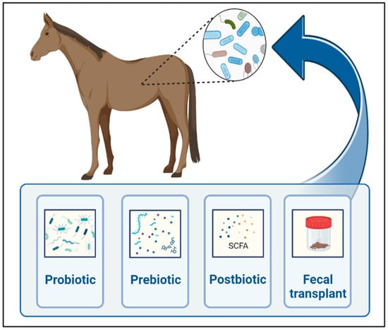 As we learn more about the gut microbiome’s influence on gastrointestinal and remote organ diseases in horses, the modulation of gut microbiota to restore microbial homeostasis gains interest in regard to the prevention and treatment of various conditions. Strategies to modulate gut microbiota include prebiotics, probiotics, symbiotics, postbiotics, antibiotics, bacteriophages, fecal microbiota transplant, and diet (Figure 2).