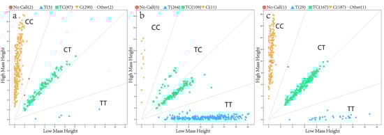 Genotyping results of candidate SNPs in NOX4, PDE11A and GHR genes using MassARRAY®SNP system. (a) c.1057-4C > T in NOX4; (b) c.1983C > T in PDE11A; (c) c.1618C > T in GHR.