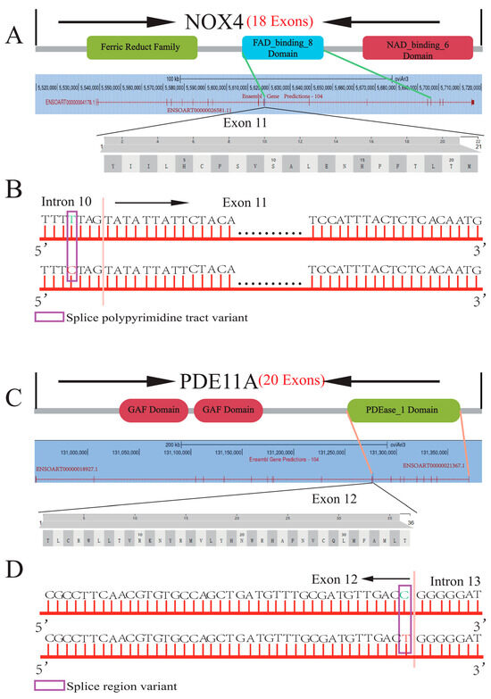 The location and functional domain of NOX4 c.1057-4C > T and PDE11A c.1983 C > T. (A) Functional domain of NOX4 and the location of exon 11. (B) Location of c.1057-4C > T in the NOX4 gene of sheep. (C) Functional domain of PDE11A and the location of exon 12. (D) Location of c.1983C > T in the PDE11A gene of sheep.