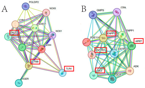 In order to further understand the biological functions of NOX4 and PDE11A genes in the reproduction process of sheep, the protein networks that closely interact with them were constructed. Among the 10 strongest interacting proteins with NOX4 (Figure 3A,B), 3 (TLR4, NCF2 and CYBB) are crucial for follicular development as well as ovulation [22,23,24,25]. Among the 10 proteins that closely interact with PDE11A, 4 (AK3, APRT, ENPP3 and ENTPD1) are closely associated with oocyte development and ovulation [26,27,28].