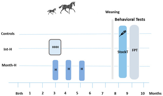 Experimental design used in the present study. Beginning at 3 months ± 7 days old, foals were subjected to forced handling daily for three days, Int-H (N = 12), or once monthly, Month-H (N = 9), while controls (N = 10) were left undisturbed. After weaning, all experimental foals (N = 31) were subjected to two consecutive days of behavioral tests, including isolation, restraint, blood sampling, and deworming. Abbreviations: Int-H: intensively handled group; Month-H: monthly handled group; StockT: stock test; FPT: forced-person test; H: 1 session of handling procedure; HHH: 3 sessions of handling procedure.