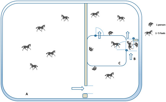 Overhead view of the testing pen and the outdoor paddock used for the behavioral tests. All foals (N = 57) were in a 16 × 20 m outdoor paddock together (A). In the days of testing, the foals were led freely to a stock (B) to be tested during restraint in the stock test or to the open arena (C) for forced-person test evaluations. When being tested, each animal was surrounded by its peers and by hidden observers on all sides. A dark net did not allow visual contact with other foals and separated them physically. The persons present were 2 researchers, 2 veterinarians, and 3 handlers.