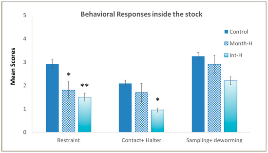 Our aim with the behavioral tests was to determine the handling effect in young horses exposed to stressful procedures, such as isolation in new environments, and to human presence, contact, and veterinary procedures. Handling significantly affected the foals’ responses inside a stock (Figure 2B), with the handled ones displaying lower reactivity when isolated and restrained, regardless of the intensity of handling (daily or monthly) (χ2(2) = 13.6, p = 0.03). Kruskal–Wallis H tests also revealed statistical differences in foals’ reactions to human contact and to haltering (χ2(2) = 12.7, p = 0.042), and when compared by pairs, we found that Int-H foals tolerated human contact better than controls (0.95 vs. 2.08, p = 0.031). The administration of vaccines and paste dewormer and blood sampling were not affected by previous handling (χ2(2) = 4.1, ns), and no differences were found among experimental groups during veterinary procedures inside the stock (see Figure 3).