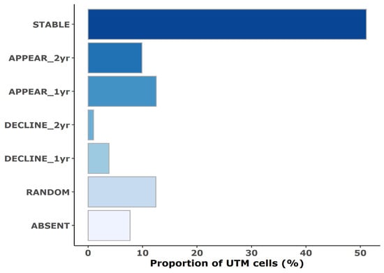 Trends in wildcat occurrence during the survey’s time frame based on the relative proportion of the studied UTM cells. STABLE = wildcats were reported present in each survey year, APPEAR_2yr = wildcats were reported present in the last two survey years, APPEAR_1yr = wildcats were reported present in the last survey year only, DECLINE_2yr = wildcats were reported present in the first two survey years only, DECLINE_1yr = wildcats were reported present in the first year of the survey only; RANDOM = wildcats temporarily disappeared or reappeared in 2014, ABSENT = wildcats were reported absent in each survey year.
