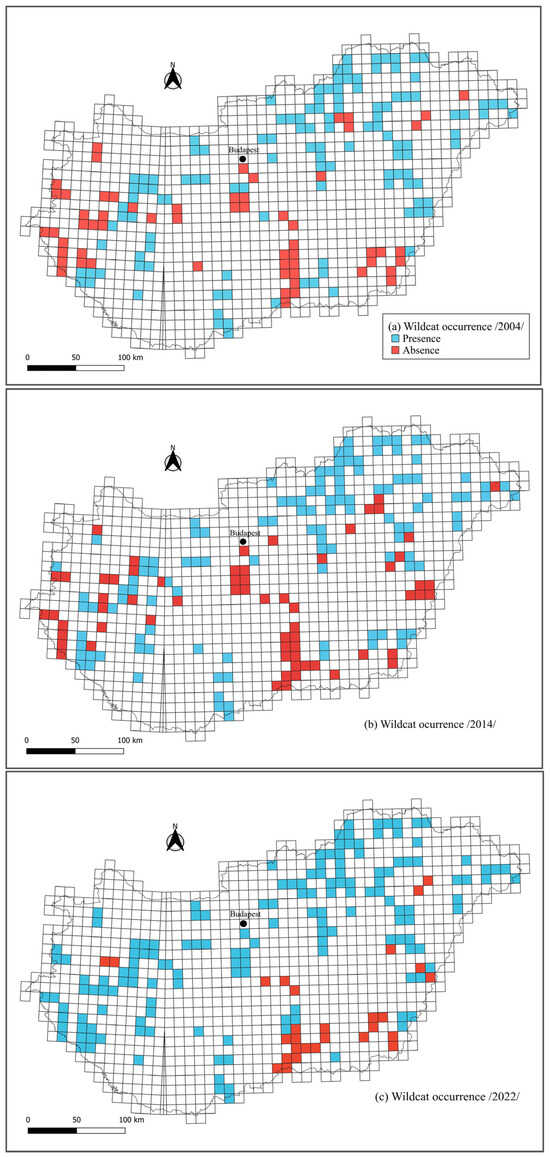 In this study, we used offline (paper) and online questionnaire data collected from game management units (GMUs) to (1) assess the present wildcat distribution in Hungary on a broad scale and analyze alterations in its distribution between 2004 and 2022 and (2) examine the impact of characteristic land cover types on wildcat occurrence across the country. A robust understanding of how the species’ distribution changes over time and the variables that influence these changes provides essential data for identifying priority areas for the long-term persistence and effective conservation of this elusive species.