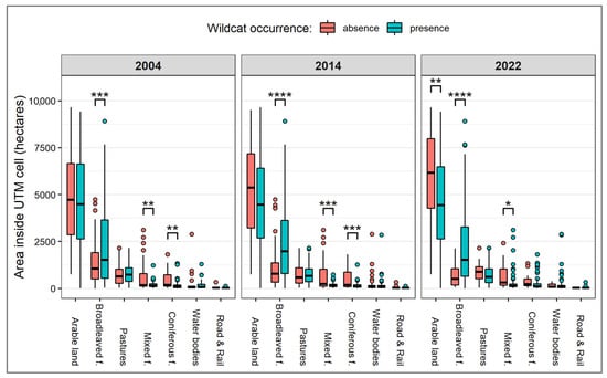 Box plot comparing the area of land cover types in UTM cells with and without reported wildcat presence. Asterisks represent the significant pairwise differences indicated using Welch’s two-sample t-test. **** p < 0.0001, *** p < 0.001, ** p < 0.01, * p < 0.05.