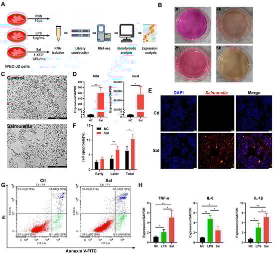 Evaluation of the deleterious effect of Salmonella enterica on IPEC-J2 cells. (A) Outline of the experiment and data analysis workflow. (B) Alteration in the medium under Salmonella infection for different periods of time (2, 4 and 6 h). (C) Morphology analysis of IPEC-J2 cells under Salmonella enterica infection for 4 h. Scale bars are 100 μm. (D) Expression of hilA and invA of IPEC-J2 cells under Salmonella enterica infection for 4 h (n = 3). (E) Representative image of Salmonella (red) and nuclei (blue) in infected cells. Scale bars are 100 μm. (F) Apoptosis of IPEC-J2 cells under Salmonella enterica evaluated via the measurement of Annexin-V and PI using flow cytometry (n = 3). (G) The figure displays representative staining, with quadrant numbers indicating subpopulation percentages. The later apoptosis cells are shown as Annexin V-positive and PI-positive (bule), and the early apoptosis cells are shown as Annexin V-positive and PI-negative (green), and the normal cells are shown as Annexin V-negative and PI-negative (red). (H) The expression of TNF-α, IL-6, and IL-1β of IPEC-J2 cells under Salmonella enterica infection and LPS treatment (n = 3). Sal: Salmonella enterica; Ctl: control group; LPS: lipopolysaccharide group. *, p < 0.05; **, p < 0.01 (t-test).