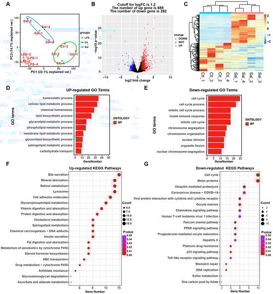 Analysis of transcriptome profiles between the Salmonella enterica-infected and control groups. (A) Principal component analysis (PCA) of all the RNA-seq samples. (B) Volcano plot and heatmap (C) of differential expression profiles. (D,E) Top 10 enriched GO terms of up-regulated and down-regulated genes. (F,G) Top 20 enriched KEGG pathway terms of up-regulated and down-regulated genes. Sal: Salmonella enterica; Ctl: control group.