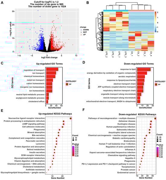 Analysis of transcriptome profiles between the LPS-treated and control groups. (A) Volcano plot and heatmap (B) of differential expression profiles. (C,D) Top 10 enriched GO terms of up-regulated and down-regulated genes. (E,F) Top 20 enriched KEGG pathway terms of up-regulated and down-regulated genes. LPS: lipopolysaccharide group; Ctl: control group.