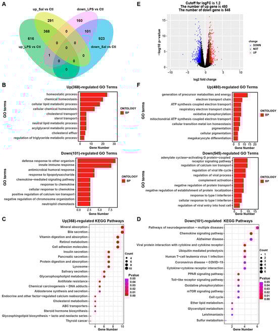 Integrative analysis of the transcriptomic profile of IPEC-J2 cells under Salmonella enterica and LPS exposure. (A) Venn diagram showing common DEGs of IPEC-J2 cells under Salmonella enterica and LPS exposure compared with those of the control group. (B) Top 10 enriched GO terms of up- and down-regulated genes. (C,D) Top 20 enriched KEGG pathway terms of up- and down-regulated genes. (E) Volcano plot of differential expression profiles of IPEC-J2 cells under Sal vs. LPS exposure. (F) Top 10 enriched GO terms of IPEC-J2 cells under Sal vs. LPS exposure with up- and down-regulated genes. Sal: Salmonella enterica; Ctl: control group; LPS: lipopolysaccharide group.