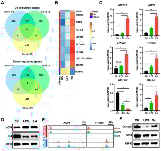 Relative expression levels of the DGEs. (A) Venn diagram showing the DEGs of IPEC-J2 cells under Salmonella enterica and LPS exposure compared with those of the control group. (B) Heatmap of 8 up-regulated genes and 1 down-regulated gene of IPEC-J2 cells under Salmonella enterica infection vs. LPS treatment. (C) Relative mRNA expression levels of the DGEs. * p < 0.05; ** p < 0.01. (D) Western blot analysis of the relative expressions of AQP8 and P53, which is the key protein of the p53 signaling pathway. (E) Visualization of the expression and chromatin accessibility of the AQP8 and THEM6 genes. Arrows indicate the position and direction of transcription initiation. (F) Western blot analysis of the relative expression of Occludin and PCNA. Sal: Salmonella enterica; Ctl: control group; LPS: lipopolysaccharide group.