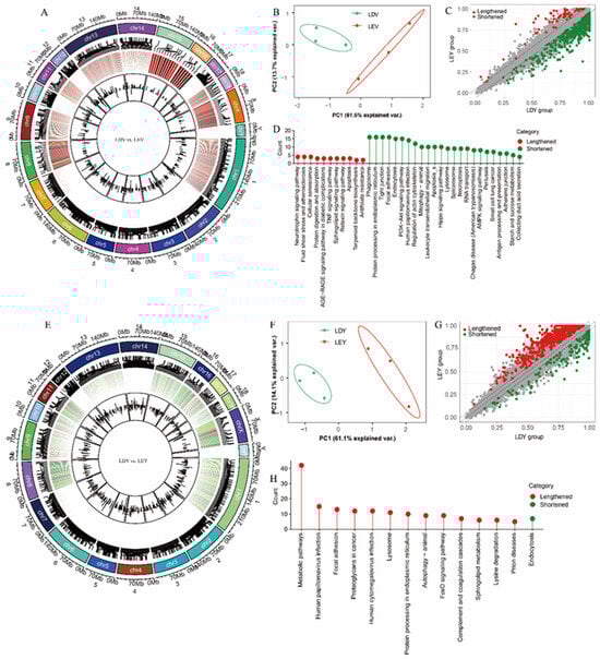 Identification and analysis of APA sites in the estrus cycles of Large White gilts. The distribution of APA sites in the vulva (A) and vagina (E). PCA of transcripts undergoing APA vulva (B) and vagina (F). Distribution of shortened and lengthened 3′-UTRs vulva (C) and vagina (G). Functional enrichment analysis of transcripts undergoing APA vulva (D) and vagina (H). LDV (vulva samples of Large White gilts at Diestrus stage), LEV (vulva samples of Large White gilts at Estrus stage), LDY (vagina samples of Large White gilts at Diestrus stage), LEY (vagina samples of Large White gilts at Estrus stage).