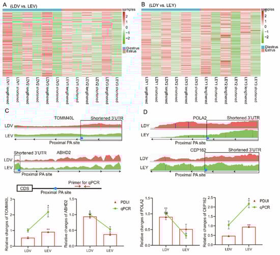 Visualization and validation of 3′-UTR expression abundance of Large White gilts. The heatmap depicts the expression patterns of lengthened and shortened 3′-UTRs in the vulva (A) and vagina (B) during the estrus and diestrus stages. IGV used to show 3′-UTR lengths and abundance of TOMM40L, ABHD2 (C), POLA2, CEP162 (D) genes. RT-qPCR was employed to validate the expression levels of their lengthened 3′-UTRs. * p < 0.05; ** p < 0.01.