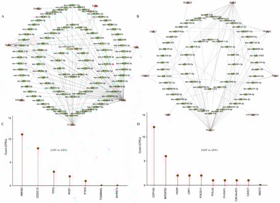 By filtering for significant transcripts with |ΔPDUI| ≥ 0.35, we obtained 7, 10, and 20 high-confidence transcripts in the LDV vs. LEV, LDY vs. LEY and LY vs. LV comparisons, respectively (Table S9). We analyzed the potential miRNA binding sites within these binding sequences. We found that among the seven genes in the LDV vs. LEV comparison, a total of 95 miRNA binding sites were predicted in their lengthened 3′-UTRs (Figure 5A). Among the 10 genes in the LDY vs. LEY comparison, a total of 59 miRNA binding sites were predicted in their lengthened 3′-UTRs (Figure 5B). Furthermore, a total of 114 miRNA binding sites were predicted in the lengthened 3′-UTRs of the 10 genes in the LY vs. LV comparison (Figure S5C). These miRNAs could be one of the reasons for regulating the abundance of 3′-UTRs or mRNAs expression. Furthermore, we have also conducted predictions on the CPEs present in the lengthened 3′-UTRs of these genes (Table S10). Among them, nine genes were found to harbor more than 10 CPEs, including the NFIX, PCNX4, CEP162 and ABHD2 genes. These findings provide important clues for further research on the transcriptional regulation of genes.