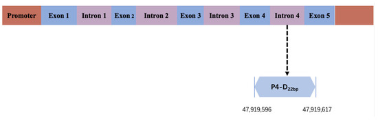 In the process of identifying genotypes within four indel loci using a pooled DNA approach, it was determined that two loci, P1-rs516271779 and P4-rs133750033, exhibited polymorphism, each displaying three genotype forms: homozygous insertion (II), homozygous deletion (DD), and heterozygous (ID) types (Figure S1, Table 1 and Table S1). The P4 locus was specifically located in the fourth intron of the HMGA2 gene (Figure 1). The primer diagram of the bovine HMGA2 gene is shown in Figure 2. The deletion sequence of P4, as revealed through direct sequencing, matched the sequence registered in the NCBI database (P4-22bp, CTGGAAGCAGTCCACTAGCATC) (Figure 3). Furthermore, the PCR products of P4, following a separation through 2.5% agarose gel electrophoresis, are displayed in Figure 4.