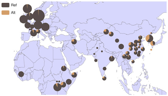 Allele frequency distribution of P4-D22bp of HMGA2 in 54 cattle breeds worldwide. Note: REF: reference genotype; ALT: alternate genotype.
