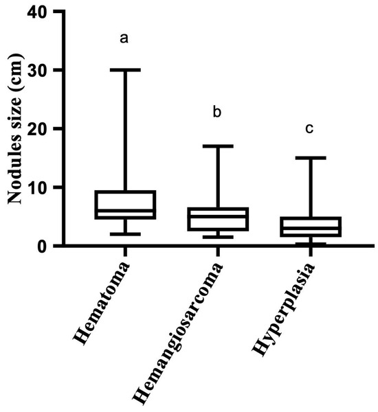 Splenic nodule sizes according to morphological diagnosis (hematoma, hemangiosarcoma, and hyperplasia). Hematomas were larger than hemangiosarcoma and hyperplasia. Hemangiosarcoma were larger than hyperplasia. Different letters denote significant differences. p < 0.0001. Kruskal–Wallis test.