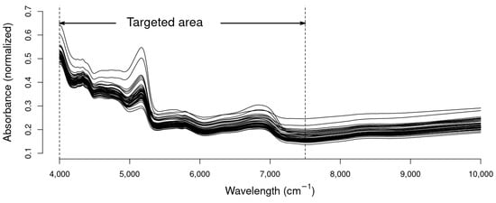 Figure 1 provides a visual representation of the raw data obtained from scanning the 48 excreta samples with NIRS. Notably, the first inflection point in the spectrum is observed at approximately the 7500 cm−1 wavelength. This observed inflection point prompted thorough calibrations, both inclusive and exclusive of the 10,000–7500 cm−1 range, in order to assess the impact of this highlighted area on the improvement of the results. The scattering effect between the different spectra of each sample is graphically evident, highlighting the need for scatter correction processing during the calibration phase.