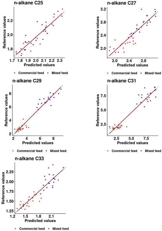 Figure 2 illustrates the selected calibration models of the investigated n-alkanes, providing key insights. It is notable that for C25, C27, and C33, the dispersion of the samples suggests a cohesive grouping, implying a consistent response pattern. In contrast, the grouping among animals receiving the two different diets (with or without alfalfa supplementation) is particularly pronounced for C29 and C31. The observed splitting in these cases implies a discernible influence of dietary variation, highlighting the sensitivity of the calibration models to specific dietary composition.