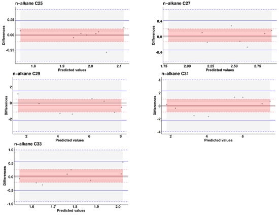 Bland–Altman plot: Predicted vs. differences analysis for n-alkanes concentrations in excreta samples from laying hens (Solid red line is the bias, the dashed red lines are the limits of the 95% confidence interval of the bias. Solid blue lines are the 95% limits of agreement, dashed blue lines are the 95% confidence interval limits for the limits of agreement).