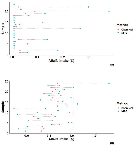 Various statistical metrics, including RMSE, variance, and bias, were used to evaluate the accuracy of these estimates and summarized in Table 5. For animals on the commercial diet, the average alfalfa inclusion rate varied around 0.017 and 0.066 using laboratory and NIR data, respectively. Estimation using NIR predictions showed a relatively higher RMSE of approximately 0.126 compared to 0.032 using laboratory data. Conversely, for animals receiving a diet containing 1% alfalfa, the precision remained consistent, registering around 0.80% for both laboratory and NIR-generated data, indicating a moderate underestimation of 0.20. It is noteworthy that the use of NIR-generated n-alkane concentration data for all n-alkanes studied demonstrated a relatively accurate prediction of the proportion of alfalfa added to the diet on a dry matter basis, depending on the specific diet received.