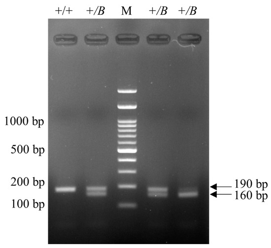 Agarose gel electrophoresis image from PCR-RFLP for FecB. PCR-RFLP, polymerase chain reaction-restriction fragment length polymorphism; FecB, Booroola polymorphism of bone morphogenetic protein receptor-1b (BMPR1B) gene; M, DNA Marker (100 bp + 3K); +/+, non-carrier or wildtype; +/B, heterozygous FecB genotype.