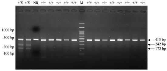Agarose gel electrophoresis image from PCR-RFLP for FecGE. PCR-RFLP, polymerase chain reaction-restriction fragment length polymorphism; FecGE, Embrapa polymorphism of growth differentiation factor 9 (GDF9) gene; M, DNA Marker (100 bp + 3K). +/+, non-carrier or wildtype; +/E, heterozygous FecGE genotype; NR, FecGE PCR product without RFLP.
