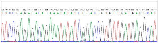 Sequencing result for FecB from identified FecB carrier. The sample contains both Adenine and Guanine at position 128 representing heterozygous genotype of FecB (+/B). FecB, Booroola polymorphism of bone morphogenetic protein receptor-1b (BMPR1B) gene.