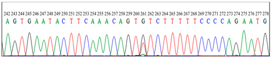 Sequencing result for FecGE from identified FecGE carrier. The sample contains Thymine and Guanine at position 261 representing heterozygous genotype of FecGE. FecGE, Embrapa polymorphism of growth differentiation factor 9 (GDF9) gene.