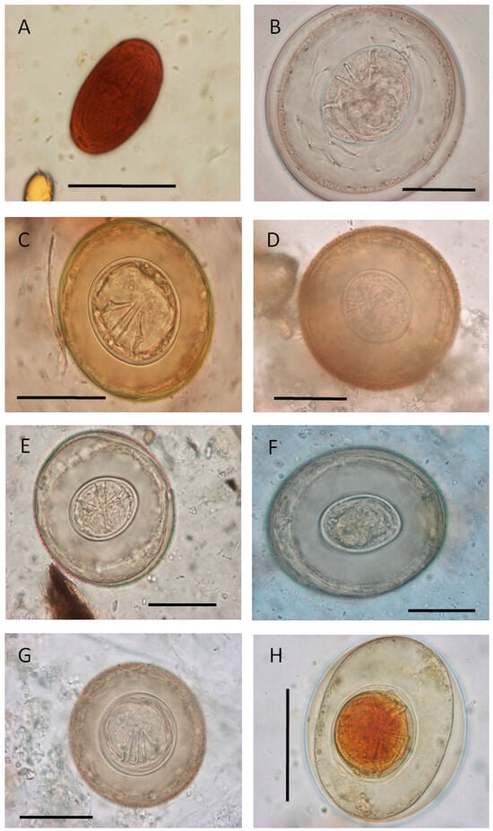Eggs from indirect life-cycle parasite species found in the samplings. (A) Unidentified trematode egg resembling Dicrocoelium (Dujarding 1845) egg from the sun bear (Helarctos malayanus). (B–H) Cestode eggs. (B) Raillietina-like eggs from the helmeted guineafowl (Numida meleagris). (C) Unidentified egg from the red deer (Cervus elaphus); (D) unidentified egg from the yak (Bos grunniens); (E) unidentified egg from the South American tapir (Tapirus terrestris); (F) unidentified egg from the hippopotamus (Hippopotamus amphibious); (G) unidentified egg from common brown lemur (Eulemur fulvus); (H) unidentified egg from the mandrill (Mandrillus sphinx). Scale bars: 30 µm.