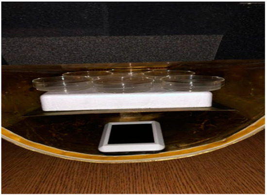 Upon arrival at the clinic, samples of each boar (n = 12) were divided into two Petri dishes (control and experimental sample (12 each for a total of 24 samples). The experimental samples were exposed in a gigahertz transverse electromagnetic (GTEM) chamber to RF-EMR at a frequency of 2500 MHz and an electric field strength of 10 Vm−1 for two hours. GTEM was located at the Clinic for Reproduction and Obstetrics at the Faculty of Veterinary Medicine University of Zagreb (45°48′25.91″ North and 16°0′20.49″ East). A GTEM-chamber was made at the Department of Communication and Space Technologies, Department of Radiocommunications and High-Frequency Electronics, Faculty of Electrical Engineering and Computing, University of Zagreb, Zagreb, Croatia. The chamber contained a digital thermometer to measure temperature to determine if there was a thermal effect of the radiation (Figure 1). The average temperature inside the chamber during semen exposure was 19.1 °C (range 18.7–19.5 °C). Control samples (unexposed samples) were placed in a metal container (imitation for GTEM-chamber) and kept under the same conditions (temperature and time) as the experimental groups but without exposure to RF-EMR. Experimental samples (exposed) and control samples (unexposed) were assessed after exposure/sham-exposure of 2 h. In addition to the chamber, an HP 8657A signal generator and an RFGA0101-05 linear amplifier were used to achieve electromagnetic field strength. The amplifier was connected to a computer and the desired frequency was set using the SynthNV program (Windfreak Technologies, LLC., New Port Richey, FL, USA). The GTEM-chamber is a transmission line that is based on TEM-chambers where the letter G indicates that the GTEM chamber works in the GHz range up to 18 GHz. The GTEM-chamber is adjustable in the pyramidal part of the TEM-chamber with an impedance of 50 Ω. After exposure, the control and experimental semen samples were evaluated for spermatozoa motility.