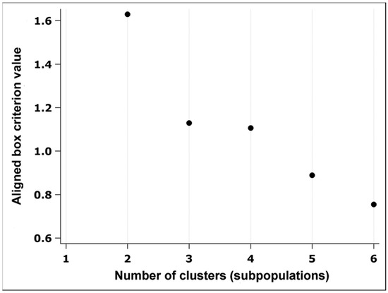 Using Table 4, the most important parameters were selected from each component (head length, head width, midpiece outline and regularity of the spermatozoa head). The final number of subpopulations was obtained using the value of the equalised box criterion. This analysis determined that the two subpopulations are the most optimal because the value of the equalised box criterion was the highest (Figure 2).
