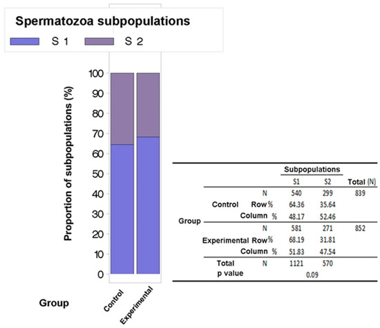 Statistical analysis of the obtained subpopulations between the control and experimental groups of semen samples revealed that the experimental semen samples group had a higher percentage of spermatozoa of the S1 subpopulation (68.2% vs. 64.4%) and a lower percentage of the S2 subpopulation (31.8% vs. 35.6%) which is close to statistical significance (p = 0.09) (Figure 3).