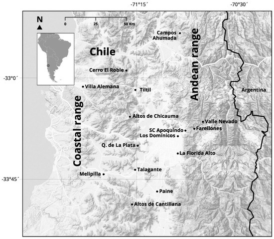 - Armesto, J.J.; Arroyo, M.T.K.; Hinojosa, L.F. The Mediterranean environment of central Chile. In The Physical Geography of South America; Veblen, T.T., Young, K.R., Orme, A.R., Eds.; Oxford University Press: Oxford, UK, 2007; pp. 184–199. [Google Scholar]