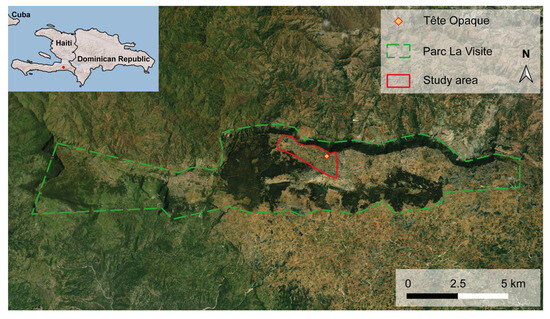 Location of study area “Tête Opaque” within the limits of Parc La Visite, southeastern Haiti. © 2023 Microsoft Corporation, accessed on 24 July 2023.