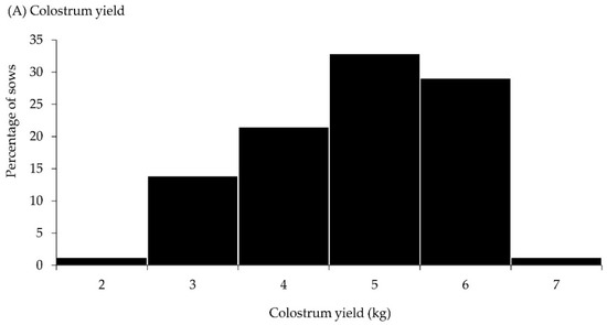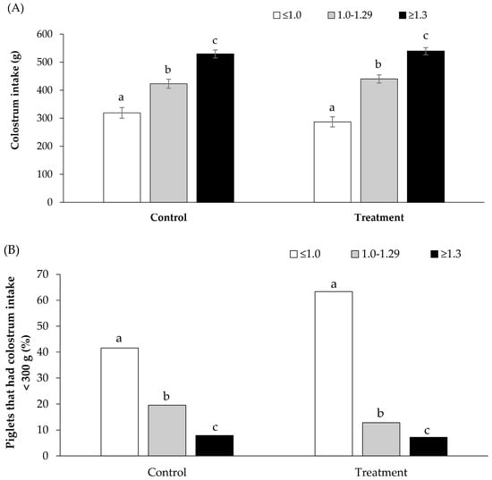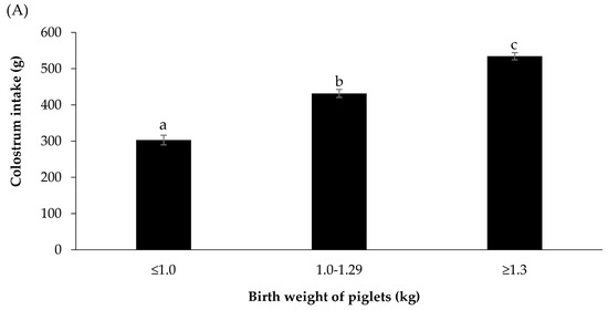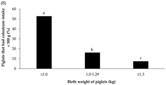 21]: colostrum intake (g) = −106 + 2.26 WG + 200 BWB + 0.111D − 1414 WG/D + 0.0182 WG/BWB, where WG represents the piglet’s weight gain over 24 h (g), BWB represents the piglet’s birth weight (kg), and D represents the duration of colostrum sucking (the time from birth to weighing at 24 h, measured in min). The sow colostrum yield was calculated by a summation of the colostrum intakes of each individual piglet within the same litter. Furthermore, the piglets were categorized into two groups based on their colostrum consumption. Briefly, piglets that had a colostrum intake <300 g and ≥300 g were classified as inadequate and adequate colostrum intake, respectively [