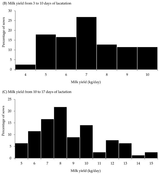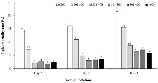 23]: milk yield between Day 3 and 10 (g) = 1.93 + 0.07 × (litter size − 9.5) + 0.04 × (litter gain, kg per day − 2.05) and milk yield between Day 10 and 17 (g) = 2.23 + 0.05 × (litter size − 9.5) + 0.23 × (litter gain, kg per day − 2.05). The number of piglet deaths at 3, 7, and 21 days of lactation was recorded, and the pre-weaning mortality rates for each time point were calculated.