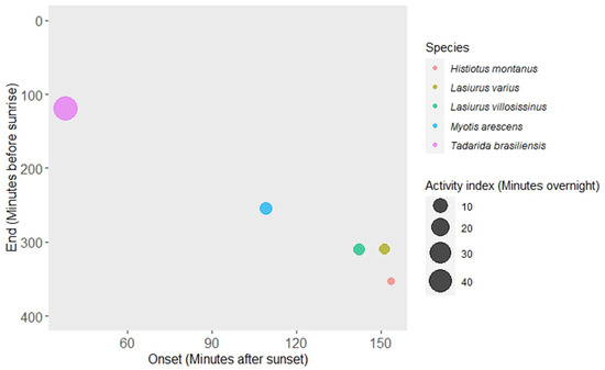 Relationships between the average onset (x-axis) and end time (y-axis) of bat activity and the relative abundance (circle size) in the agricultural landscape in central Chile.