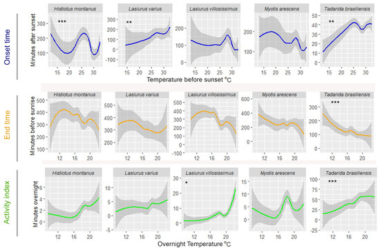 Observed changes in the onset and end time of bat activity, and the relative abundance per species in relation to air temperature in the agricultural landscape in central Chile. Gray-shaded areas indicate 95% confidence intervals. Asterisks indicate a significant relationship between the predictor and the response variable. Significance codes: *** 0.001, ** 0.01, * 0.05.