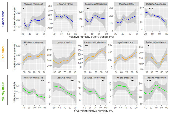 Observed changes in the onset and end time of bat activity, and the relative abundance per species in relation to relative humidity in vineyards in the agricultural landscape in central Chile. Gray-shaded areas indicate 95% confidence intervals. Asterisks indicate a significant relationship between the predictor and the response variable. Significance codes: *** 0.001, ** 0.01, * 0.05.