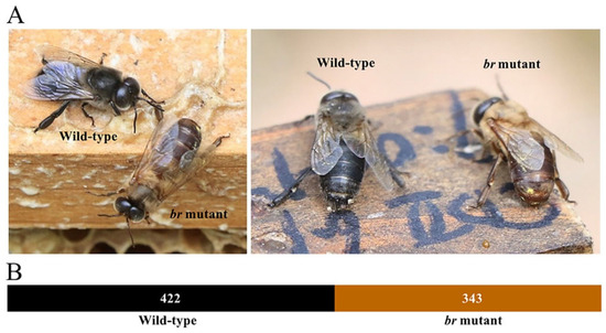 The phenotypes and number statistics of the wild−type and br−mutant drones, Apis cerana cerana. (A) The wild−type and br−mutant drones photographed under natural light. (B) The number of wild−type drones and br−mutant drones from one single queen.