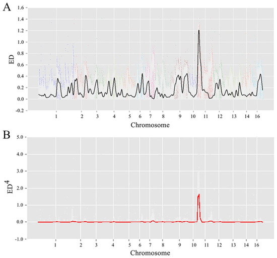 The candidate region linked to the locus was identified using resequencing and ED. Lowess regression [41] was used to fit the ED data, and the Lowess curve showed a dominant peak on chromosome 11 with mini peaks on other chromosomes (Figure 2A). To reduce the effects of low ED noise and enhance that of large ED measurements, the ED power was raised to four, and a single distinct peak on chromosome 11 was observed on the Lowess curve (Figure 2B). To narrow down the candidate region, the ED measurement on the top 0.5% ED was set as the threshold, which was 1.074. The candidate region was 0.936 MB from position 242173 to position 1177784 on chromosome 11, containing 64 genes.