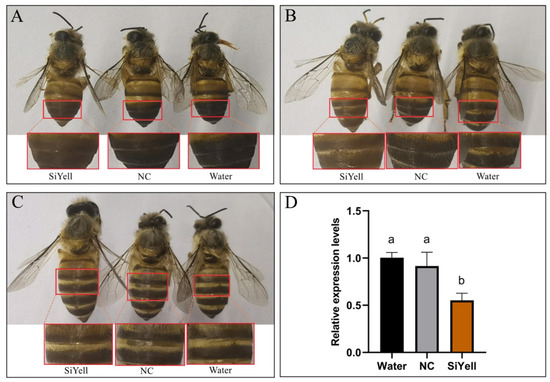 The effects of RNAi on the color phenotype and the expression of the target gene. (A–C) The color phenotypes of the one−day emerged workers after the treatment with SiYell, NC, or water. The regions inside the box were shown below the respective individual. (D) The expression of yellow at 68 h after the injection. Different letters above bars indicate significant difference.