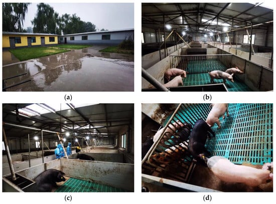 Real view of pig house environment. (a) Exterior view of pig house. (b) Internal view of the pig house. (c) Pig health checks. (d) Juvenile pigs.