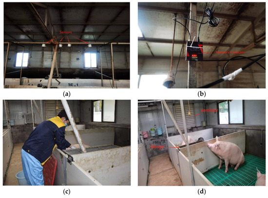 Sensor and ventilator position. (a) Environmental sensors. (b) Network collector. (c) Feeding pigs. (d) Manger and ventilator.