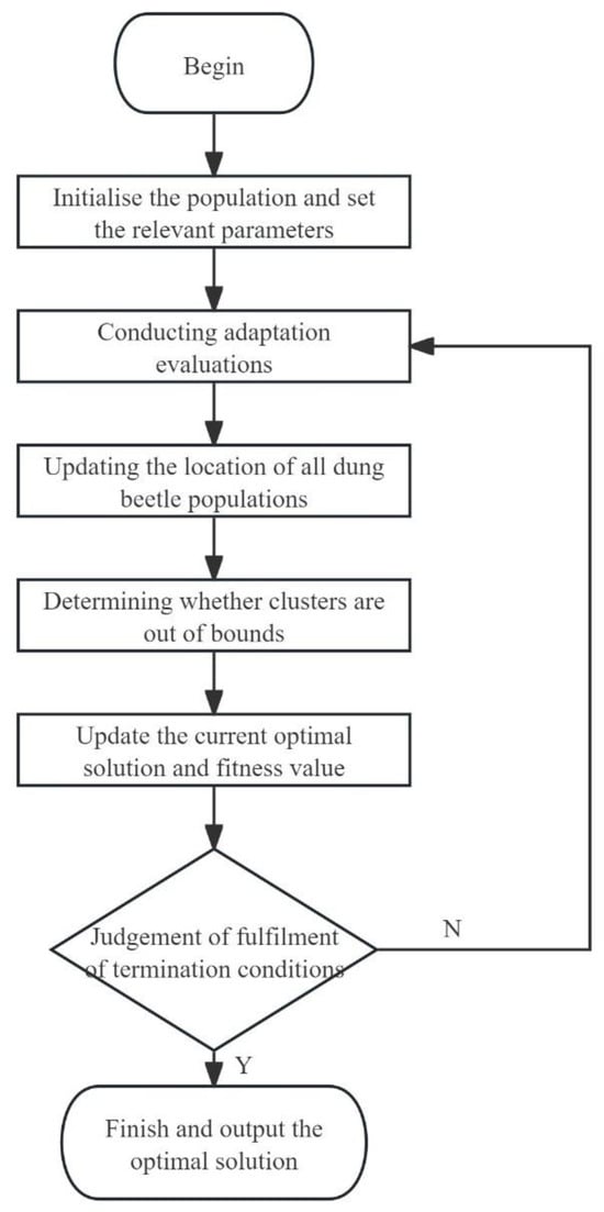 Based on the dung beetle optimization algorithm strategy, a flowchart is constructed for the main logic of the algorithm, as shown in Figure 3.