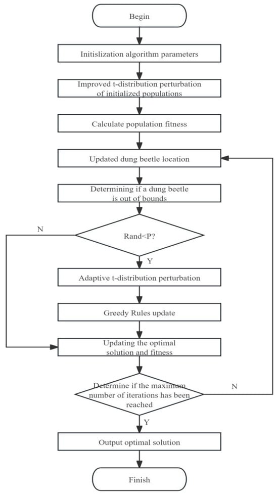 At the beginning of the iteration, the t-distribution perturbation resembles the Cauchy variation, and when the algorithm has good global exploration ability, it increases the diversity of the population, and the ability to jump out of the local optimum is enhanced. As the number of iterations increases, the t-distribution perturbation approximates the Gaussian variation, which improves the algorithm’s ability of local exploitation, and its perturbation strength for the whole population transforms from strong to weak. By introducing adaptive t-distribution mutation as an improved search strategy, the optimization performance of the algorithm can be effectively enhanced, which is conducive to improving the ability of the algorithm to escape from the local optimum. The greedy rule is also added to determine whether to update the position by comparing the fitness values of the old and new positions. The flow chart of the dung beetle optimization algorithm with the addition of t-distribution mutation is shown in Figure 4.