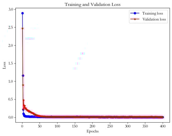 In the OTDBO−TCN−GRU model training, it can be seen by the training loss and validation loss curves in Figure 6 that both losses significantly decrease and stabilize with the increase of the training cycles (Epochs). The training loss decreases rapidly in the first few cycles, which implies that the model learns quickly from the data. As the number of cycles increases, the training loss stabilizes in almost 10 rounds of training and is almost close to 0. Meanwhile, the validation loss drops to a low level and remains stable in almost 60 rounds of training. This indicates that the model gradually improves during the learning process without overfitting, and therefore the model has strong generalization as well as prediction ability to the data.