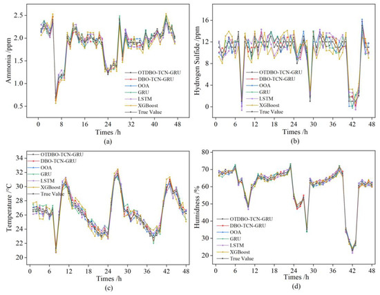Model prediction comparison chart. (a) Comparison of ammonia prediction models. (b) Comparison of Hydrogen Sulphide Prediction Models. (c) Comparison of temperature prediction models. (d) Comparison of humidity prediction models.